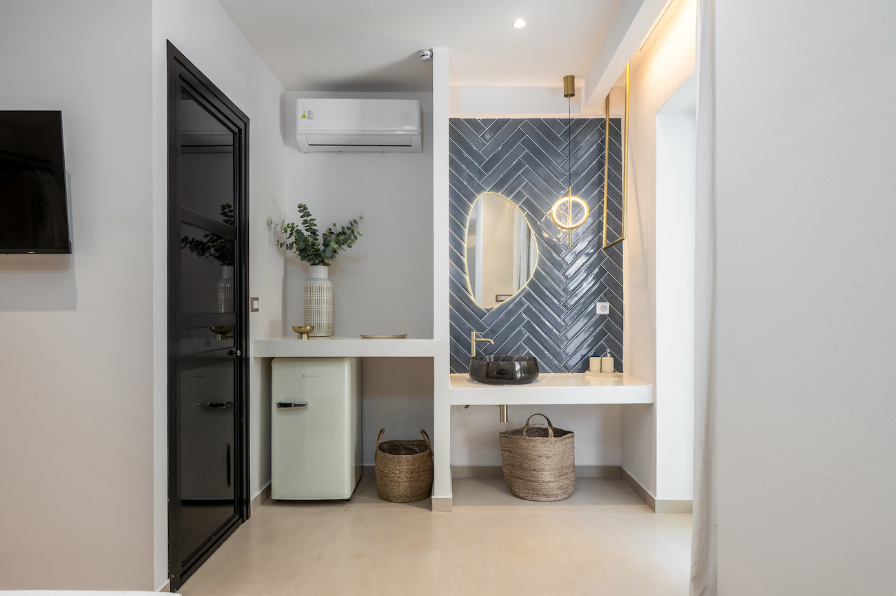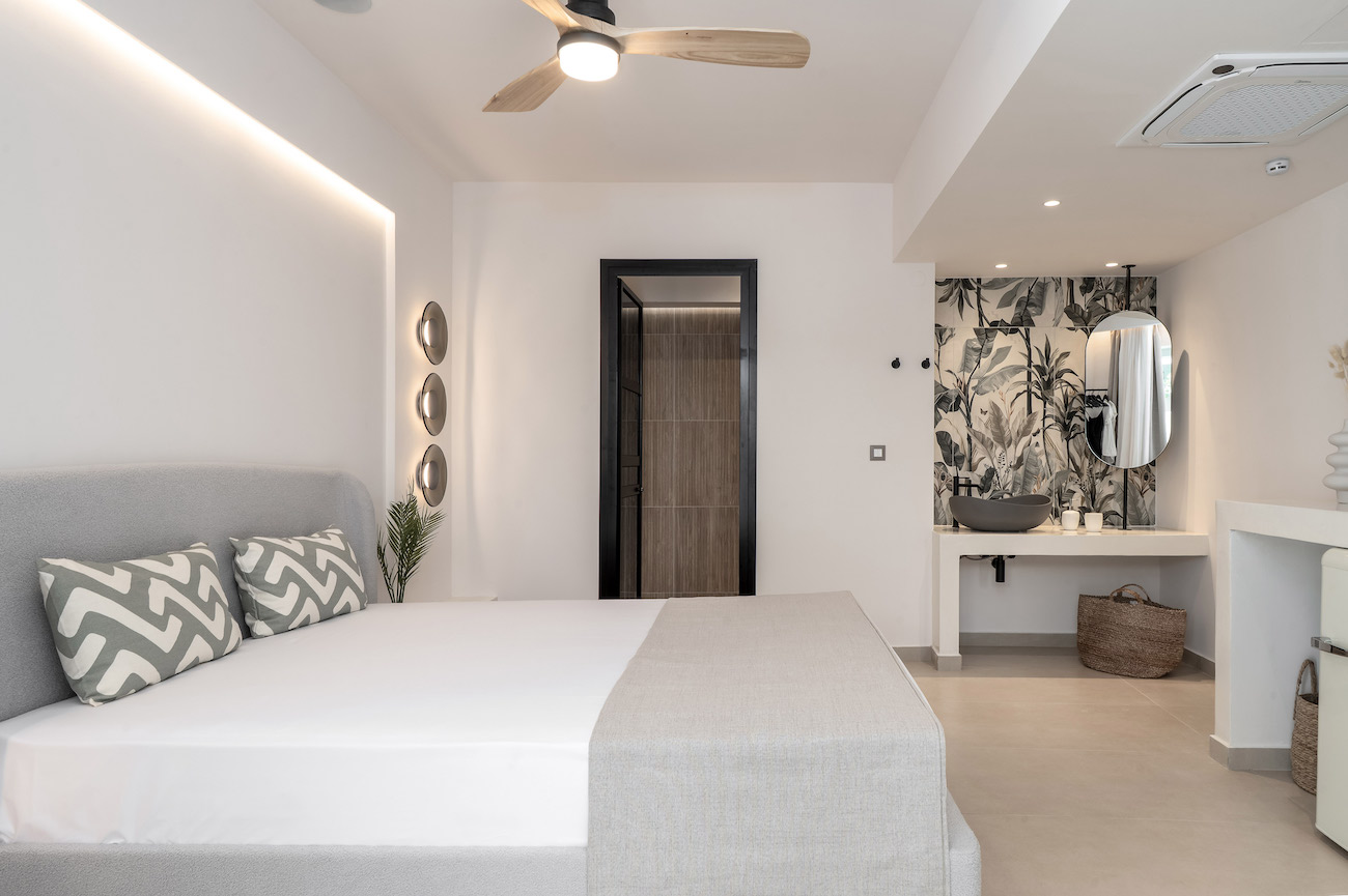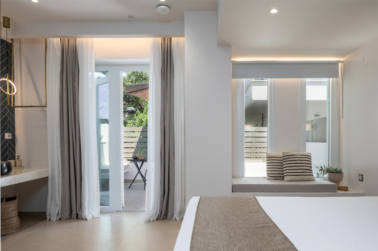 The superior ground floor double apartment has stylish decoration, creating a cozy atmosphere for your holidays. It is ideal for couples looking for a small pleasure escape, since it can accommodate up to 2 guests. The apartment features one large double bed, a modern bathroom with a shower, and all the necessary amenities that will make your stay comfortable. Lastly, the apartment has direct access to a furnished terrace overlooking the garden.