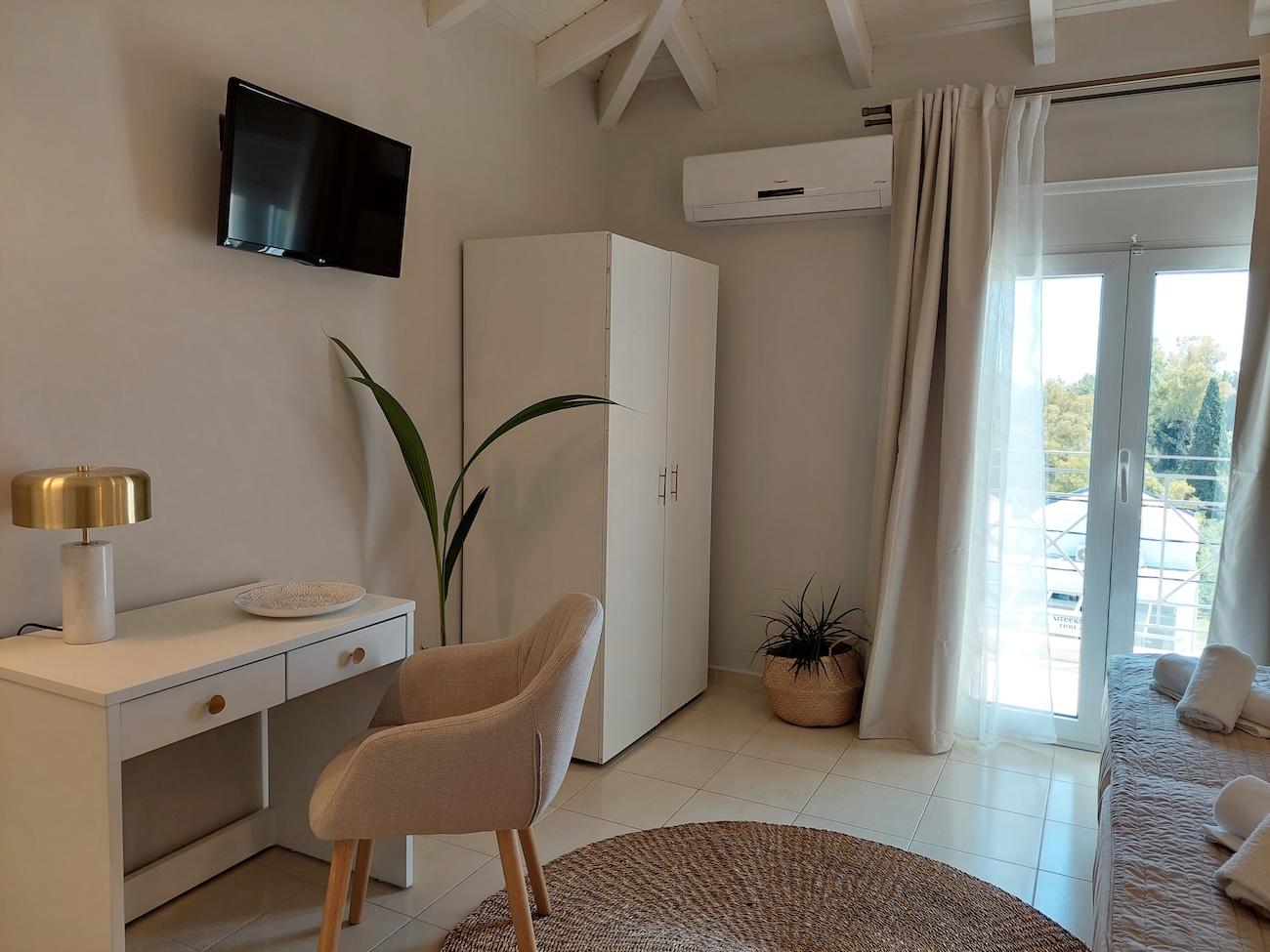 The Suite with Sea View features elegant decoration, creating a calm and welcoming atmosphere, ideal for couples seeking a relaxing escape. It can comfortably accommodate up to 2 guests and includes a spacious double bed and a modern bathroom with a shower. The suite is fully equipped with all the necessary amenities to ensure a pleasant stay. Guests also have access to a private furnished balcony, offering beautiful views of the sea.